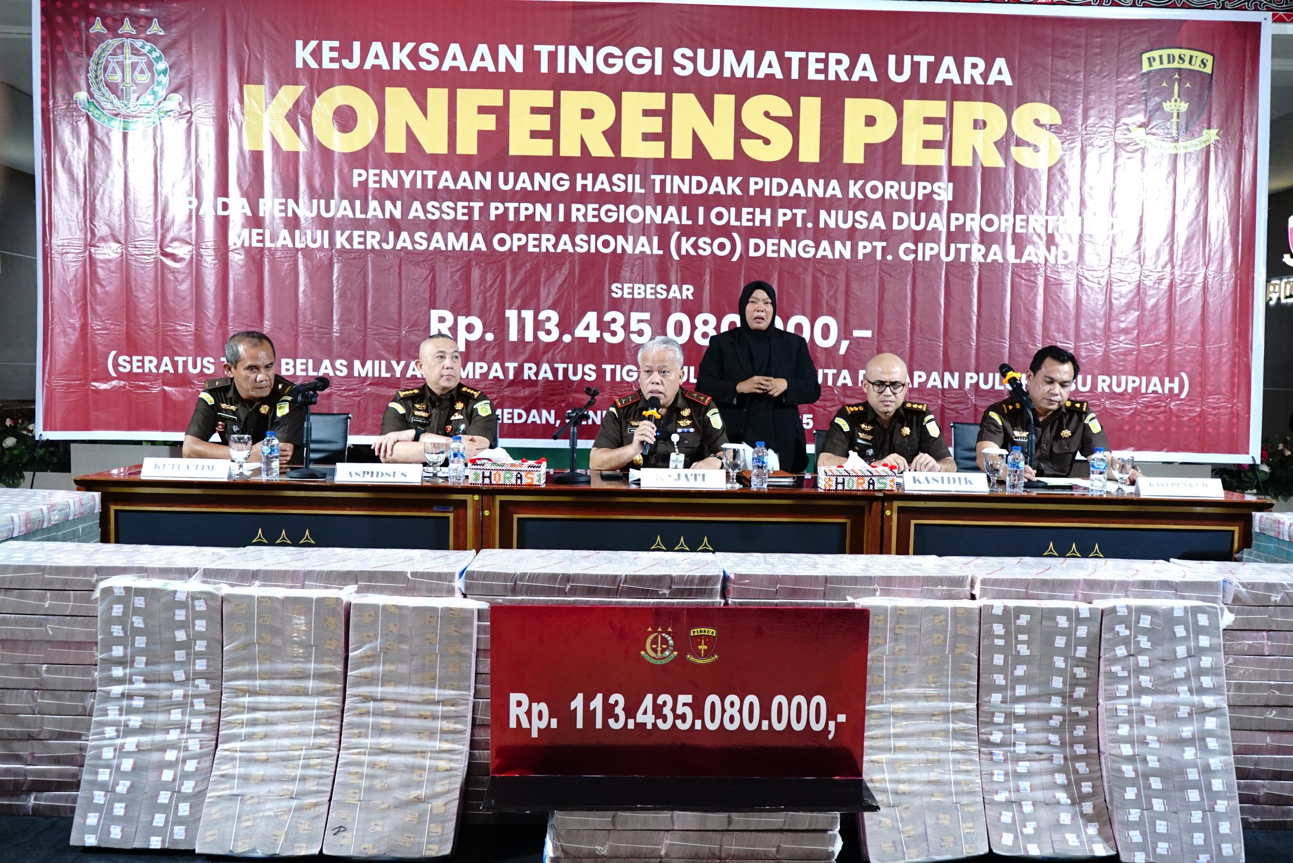 dilakukan oleh PT.NDP pada hari ini sebesar Rp.113.435.080.000,00 tersebut, maka kerugian keuangan negara akibat Tindak Pidana Korupsi pada Perkara Penjualan Aset PTPN I Regional I oleh PT. Nusa Dua Propertindo melalui Kerjasama Operasional (KSO) dengan PT. Ciputra Land telah seluruhnya dikembalikan oleh Pelaku Pidana kepada negara melalui Penyidik pada Kejaksaan Tinggi Sumatera Utara,” Kata Harli Siregar.