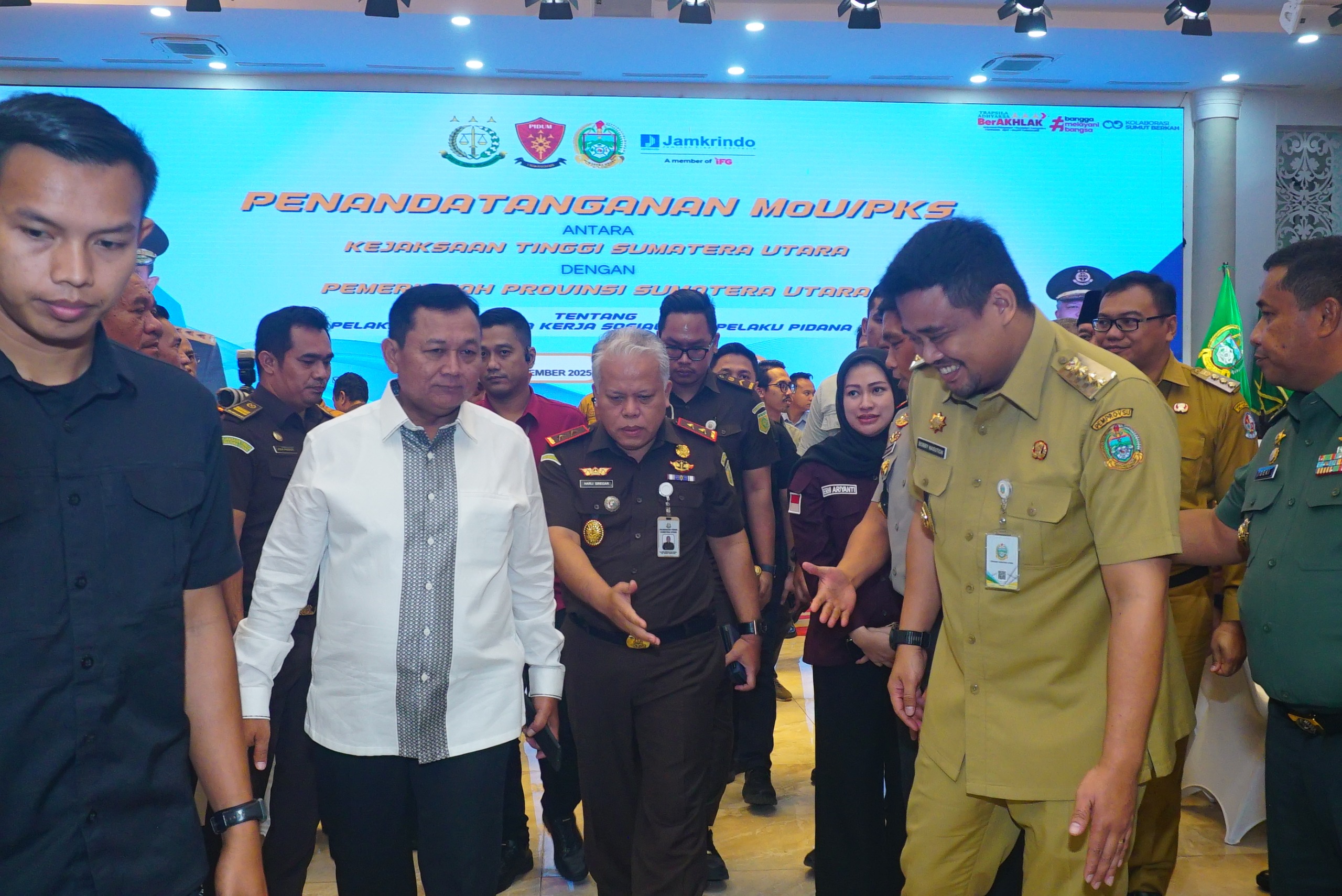 Kegiatan yang berlangsung di aula Raja Inal Siregar kantor Gubernur Provinsi Sumatera Utara Jalan Pangeran Diponegoro Medan, Selasa (18/11/2025) dihadiri Gubernur Sumut Bobby Nasution, Kajati Sumut Dr.Harli Siregar, SH.,M.Hum, Ketua DPRD Sumut Wakil Gubernur Sumut, Sekretaris Daerah Sumut, Wakapolda Sumut, Kasdam 1/BB, Danlanud Soewondo, Kabinda Sumut, Komando Daerah Angkatan Laut (Kodaeral), Para Asisten, Para Kajari, Kabag TU dan Koordinator, para Bupati/Walikota se Provinsi Sumatera Utara, pimpinan dan Jajaran Jamkrindo se-Sumatera Utara serta para Kepala OPD Provinsi Sumatera Utara.