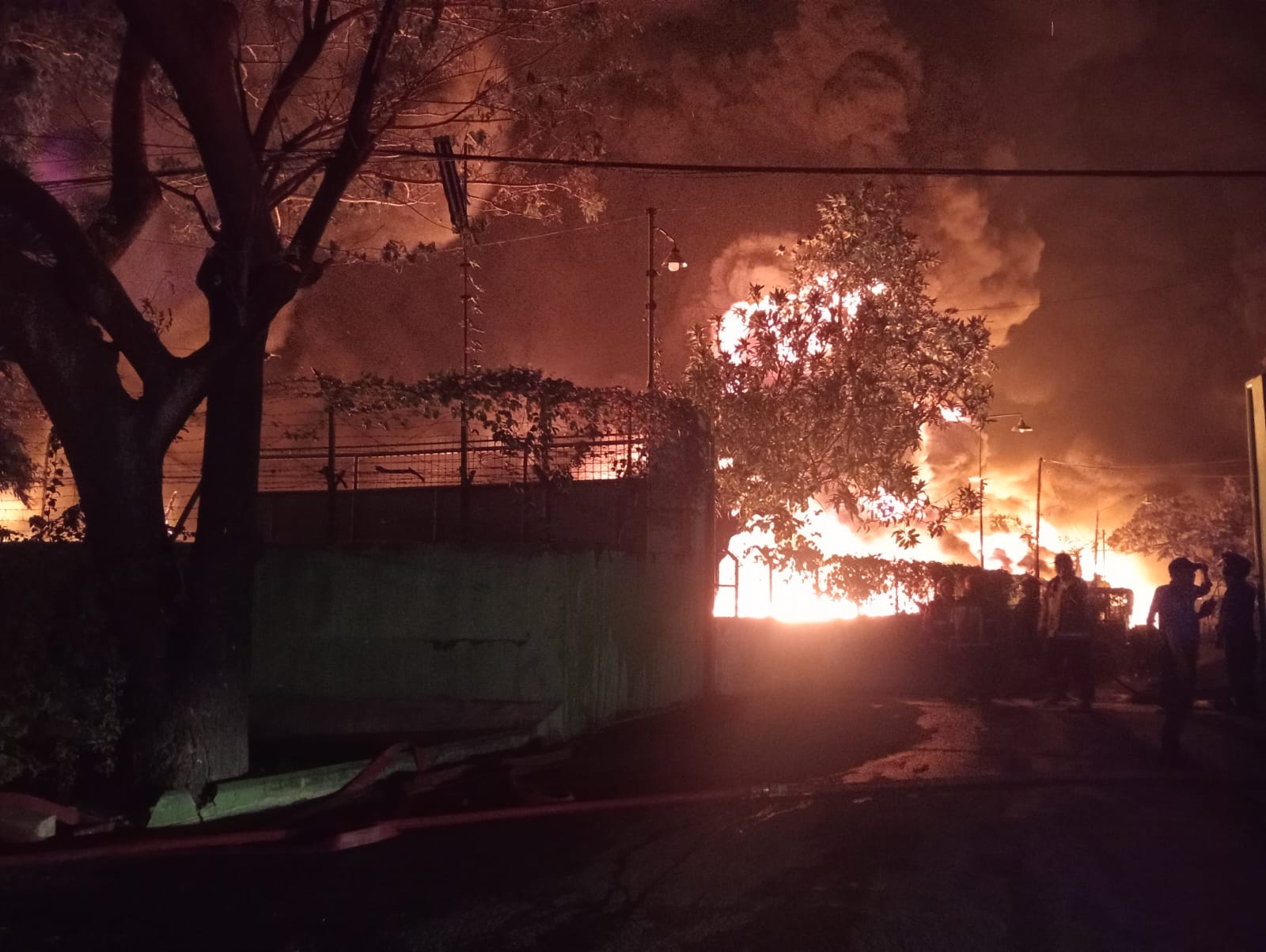 Suara ledakan beberapa kali terdengar dari dalam area pabrik, yang diduga berasal dari bahan kimia industri yang terpicu oleh suhu panas ekstrem di dalam gedung.