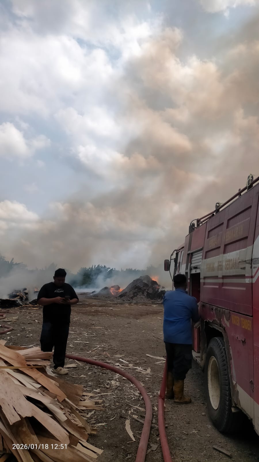 Tiga unit mobil petugas Pemadam Kebakaran sudah berada di lokasi Kebakaran untuk dapat memadamkan api, namun sudah dua jam berjalan proses pemadaman belum juga tuntas karena banyaknya tumpukan kayu bahan baku triplek yang terbakar.