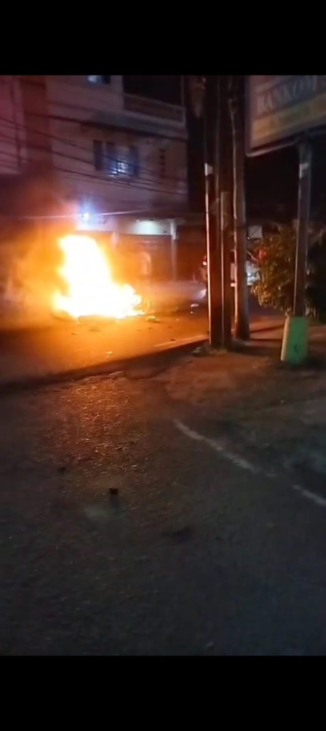 Kobaran api muncul hingga melukai pengendara sepeda motor setelah tabrakan keras terjadi. Korban telah mendapat perawatan medis, sementara kasusnya masih dalam penyelidikan.